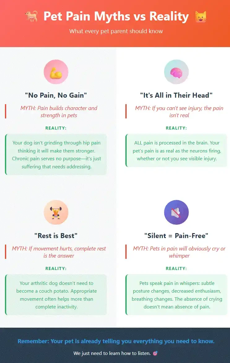 💡 Key Takeaway: Your pet's pain isn't governed by human psychology or motivational mantras. When they hurt, they're simply asking for help—not trying to build character.